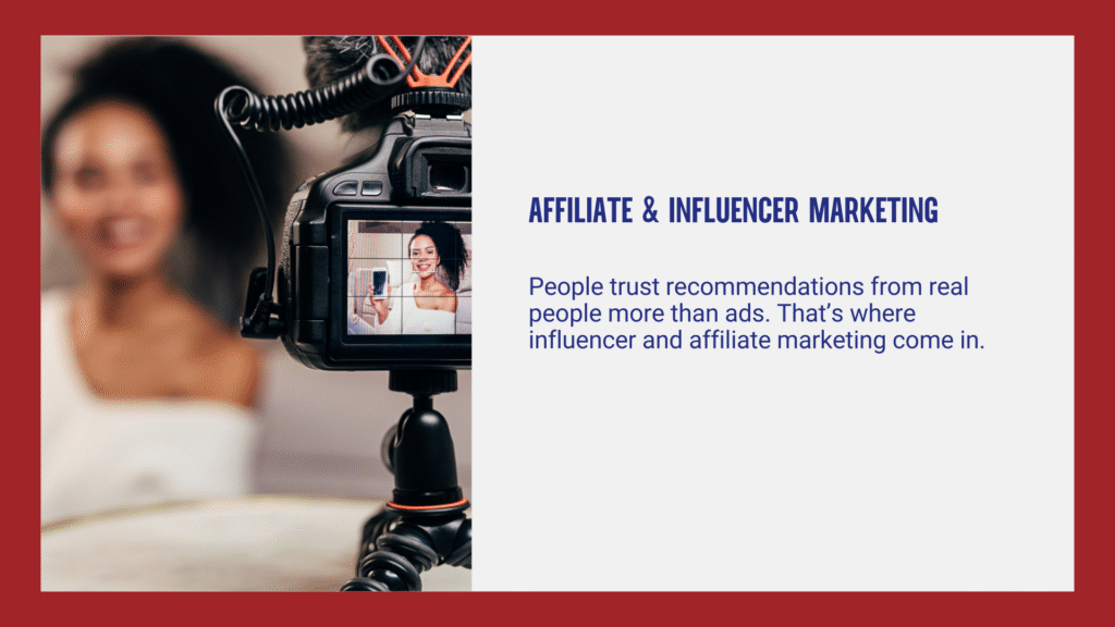 Affiliate Marketing: Paying commissions to partners who drive sales through their content. Example: A tech blogger linking to an e-commerce site and earning a percentage of sales.