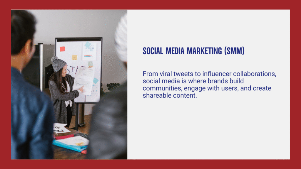 Organic Social Media: Unpaid content like posts, videos, and stories to grow brand awareness. Example: A startup posting behind-the-scenes TikTok videos to showcase its journey.